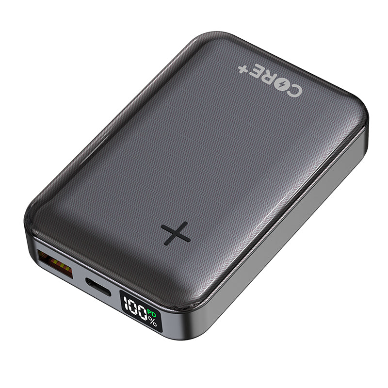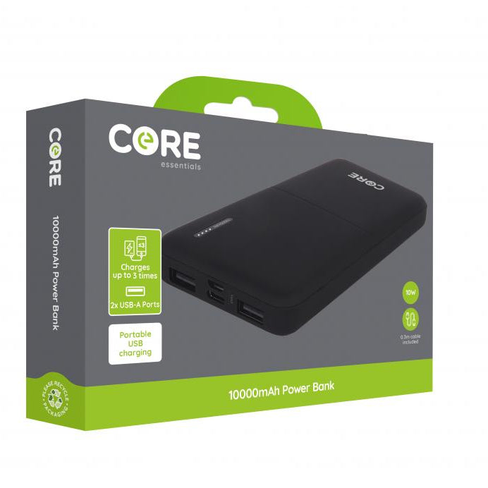 The CORE+ 10000mAh Power Bank (Black) is a compact and powerful portable charger designed to keep your devices powered on the go. With the ability to charge 2 devices simultaneously and enough capacity to charge up to 3 phones, it’s a reliable solution for staying connected. Here's a detailed overview:
