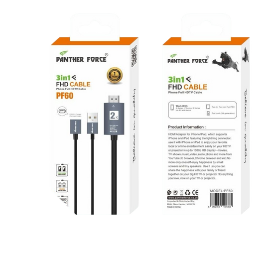 The Panther Force 3-in-1 FHD Cable is the ultimate solution for convenient charging and syncing. With its extended length, fast charging, and high-definition data transfer capabilities, this cable is designed to make your life easier and more efficient.