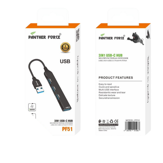 The Panther Force 3-in-1 USB-C Hub is the ultimate solution for expanding your device's connectivity and powering your productivity. Whether you're working, traveling, or multitasking, this hub delivers seamless performance in a compact and portable design.