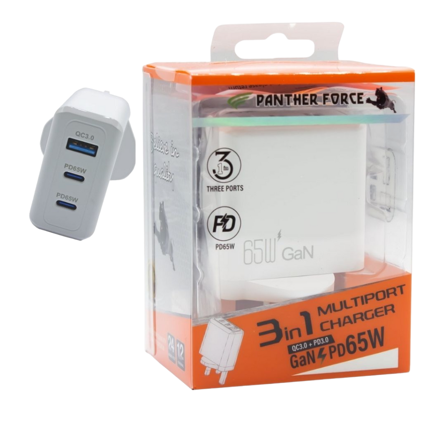 The Panther Force 65W Plug with 2 C Port/1 USB A Port (White)** is a power adapter designed to charge multiple devices simultaneously. Here's a breakdown of its key features: