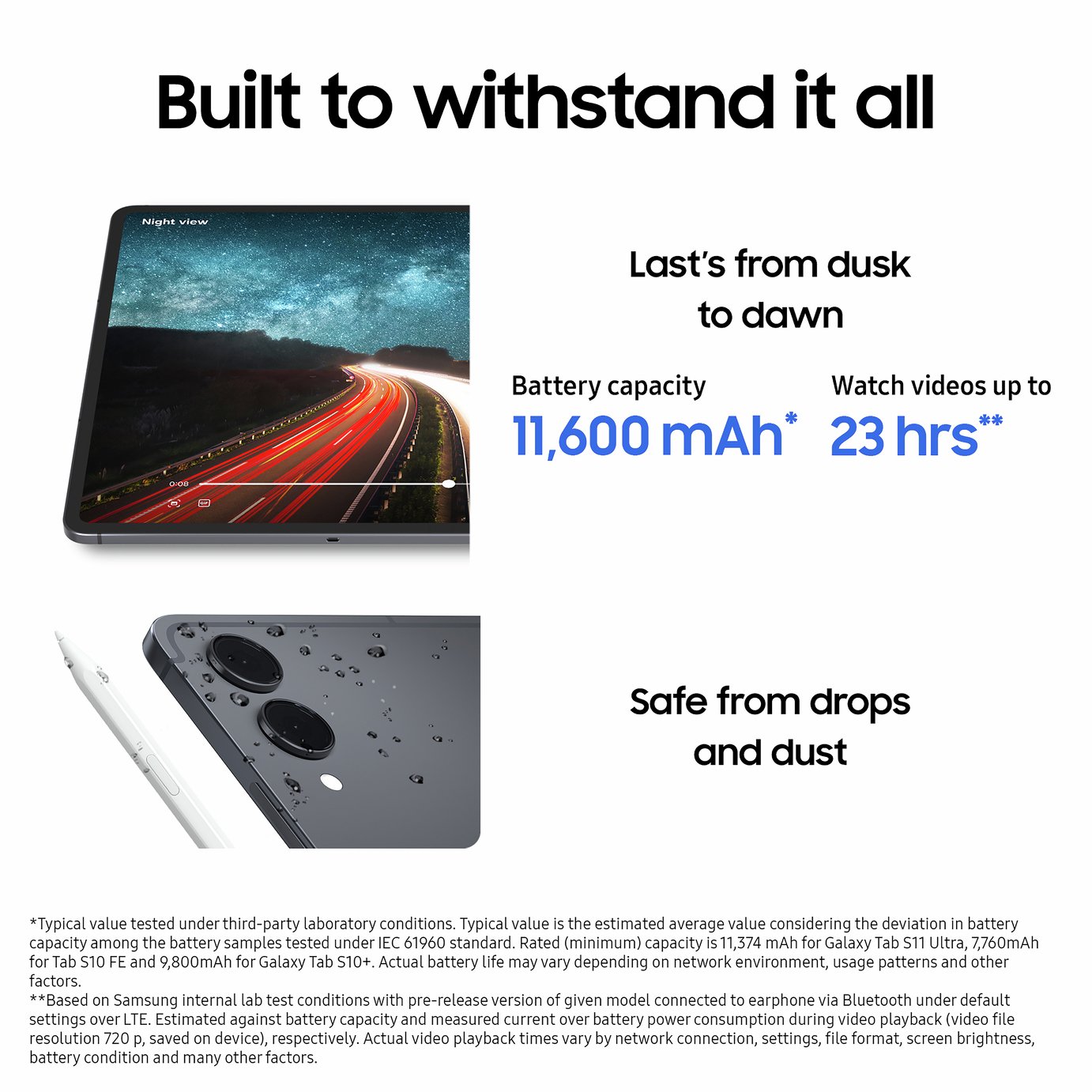 The tablet supports 5G (sub-6GHz), WiFi 7, S Pen (included), USB-C 3.2, microSD expansion (up to 2TB), and comes with a large 11,600 mAh battery with 45W fast charging.